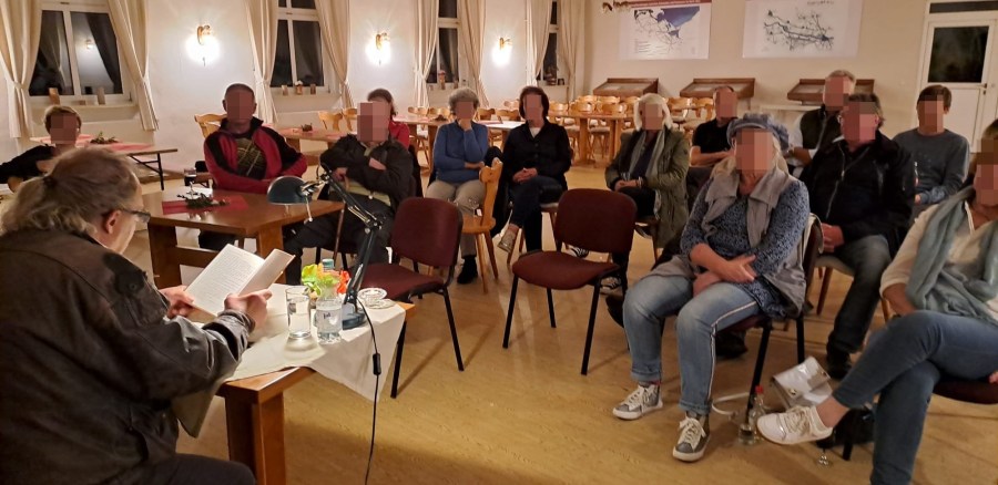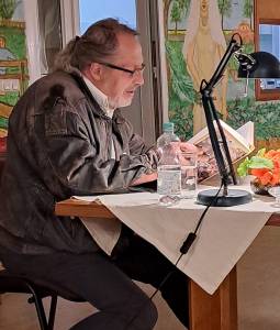 Etwa 20 Literaturbegeisterte aus der Gemeinde und auch aus der umliegenden Gegend waren anwesend. Während des Abends wurden verschiedene Ausschnitte aus seinem Buch „Iiich“ vorgelesen, und die Atmosphäre wurde durch einige seiner Lieder aufgelockert.